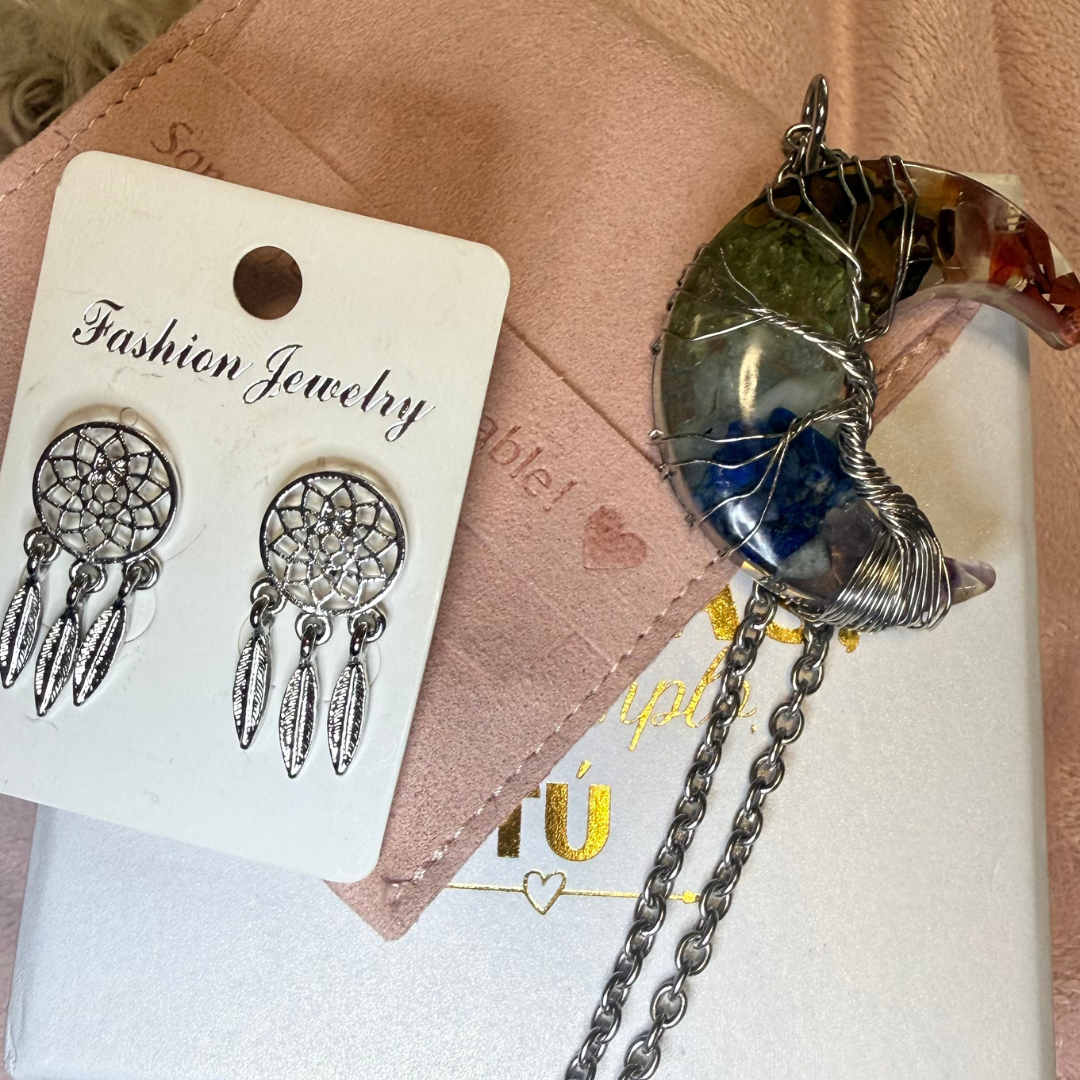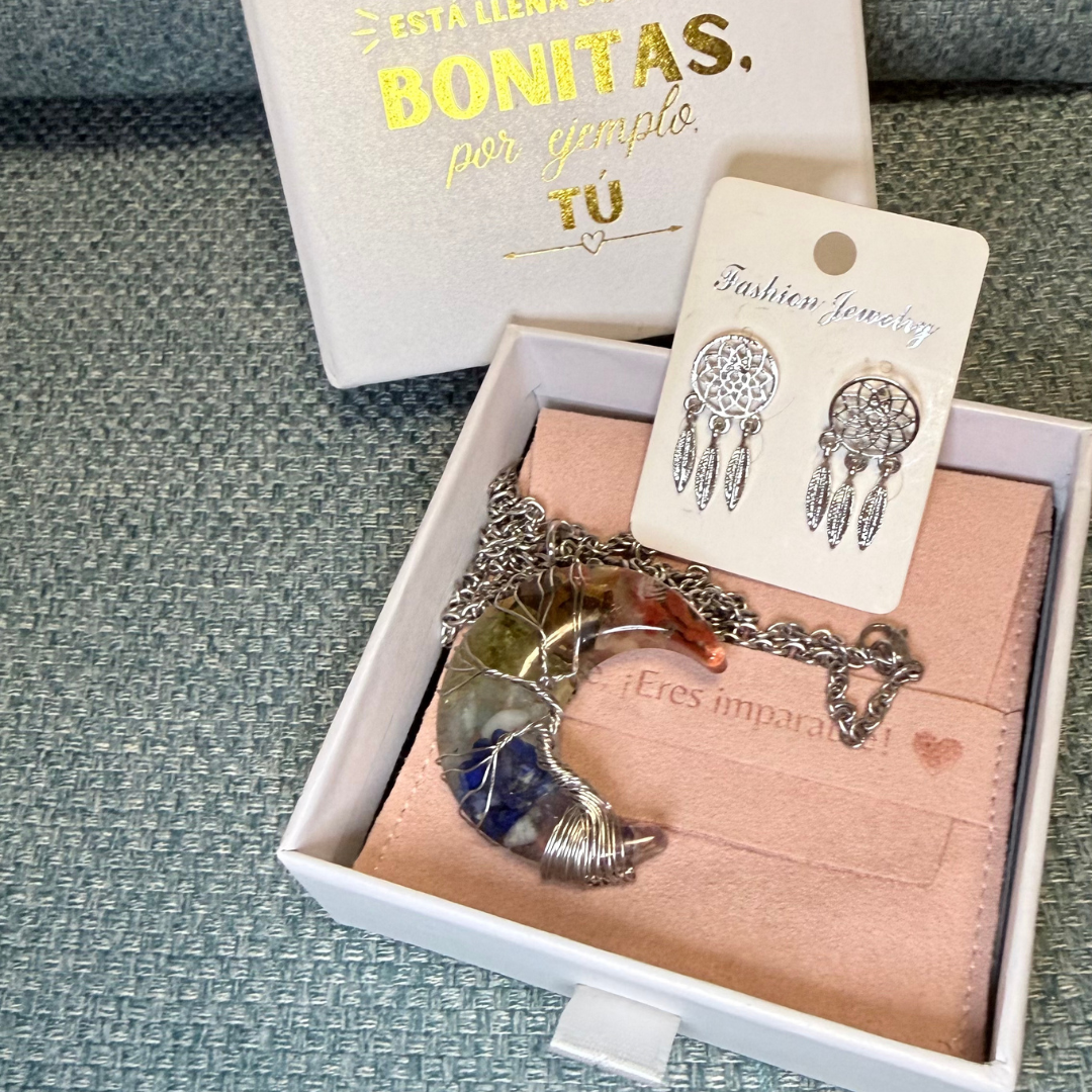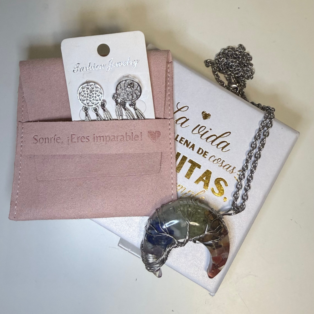 Collar Luna Mística en plata de ley con luna artesanal de piedras naturales protegidas con resina y el símbolo del Árbol de la Vida. Incluye pendientes atrapasueños de regalo.