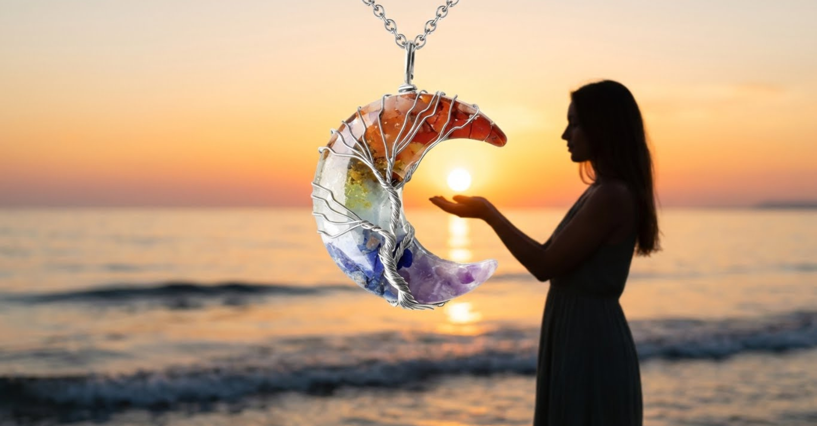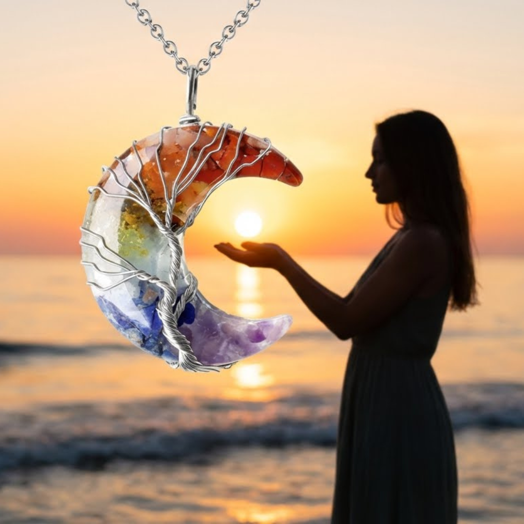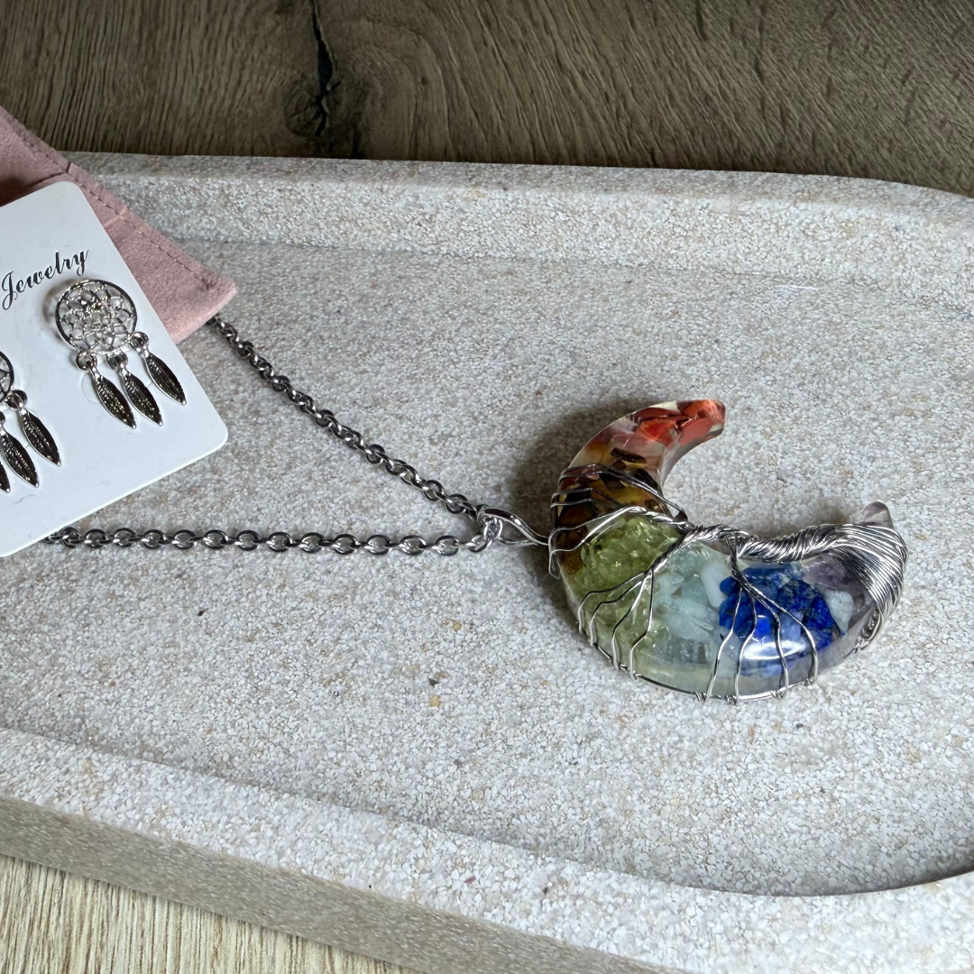 Collar Luna Mística en plata de ley con luna artesanal de piedras naturales protegidas con resina y el símbolo del Árbol de la Vida. Incluye pendientes atrapasueños de regalo.