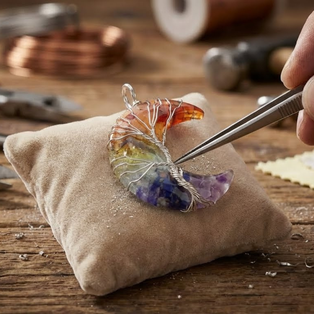 - Luna elaborada con piedras naturales: seleccionadas por su color y energía, y recubiertas con resina protectora para realzar el acabado y ayudar a preservarlas en el uso diario
