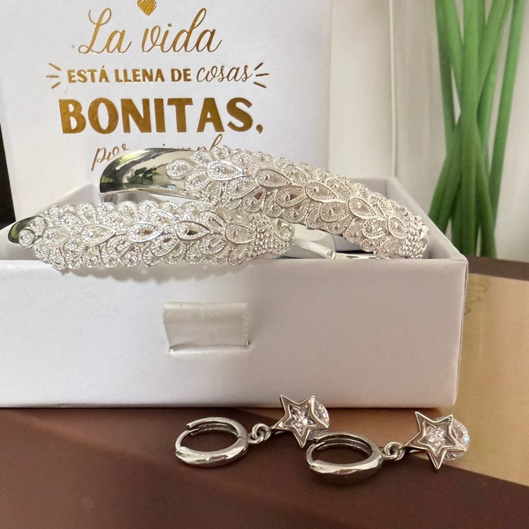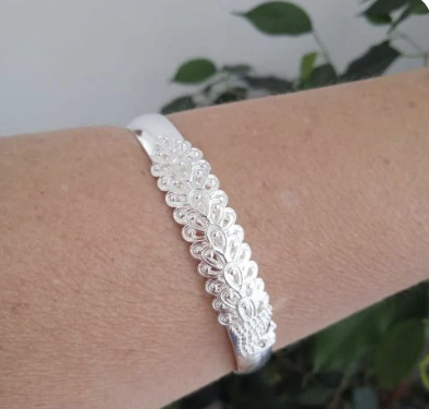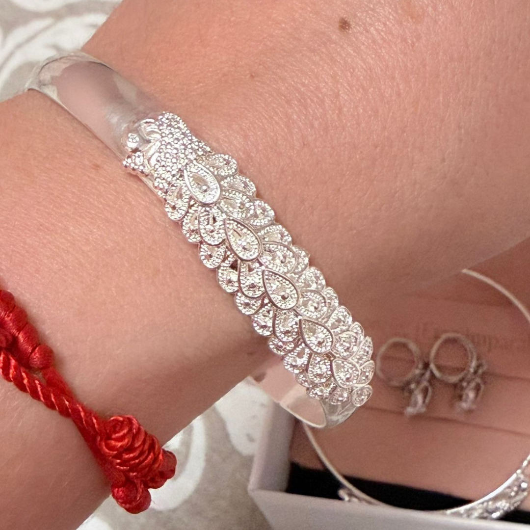 El Brazalete Destello Real está elaborado en plata de alta calidad con un diseño inspirado en el pavo real. Su acabado brillante está tratado para evitar que se ponga negro con el uso, garantizando durabilidad y elegancia